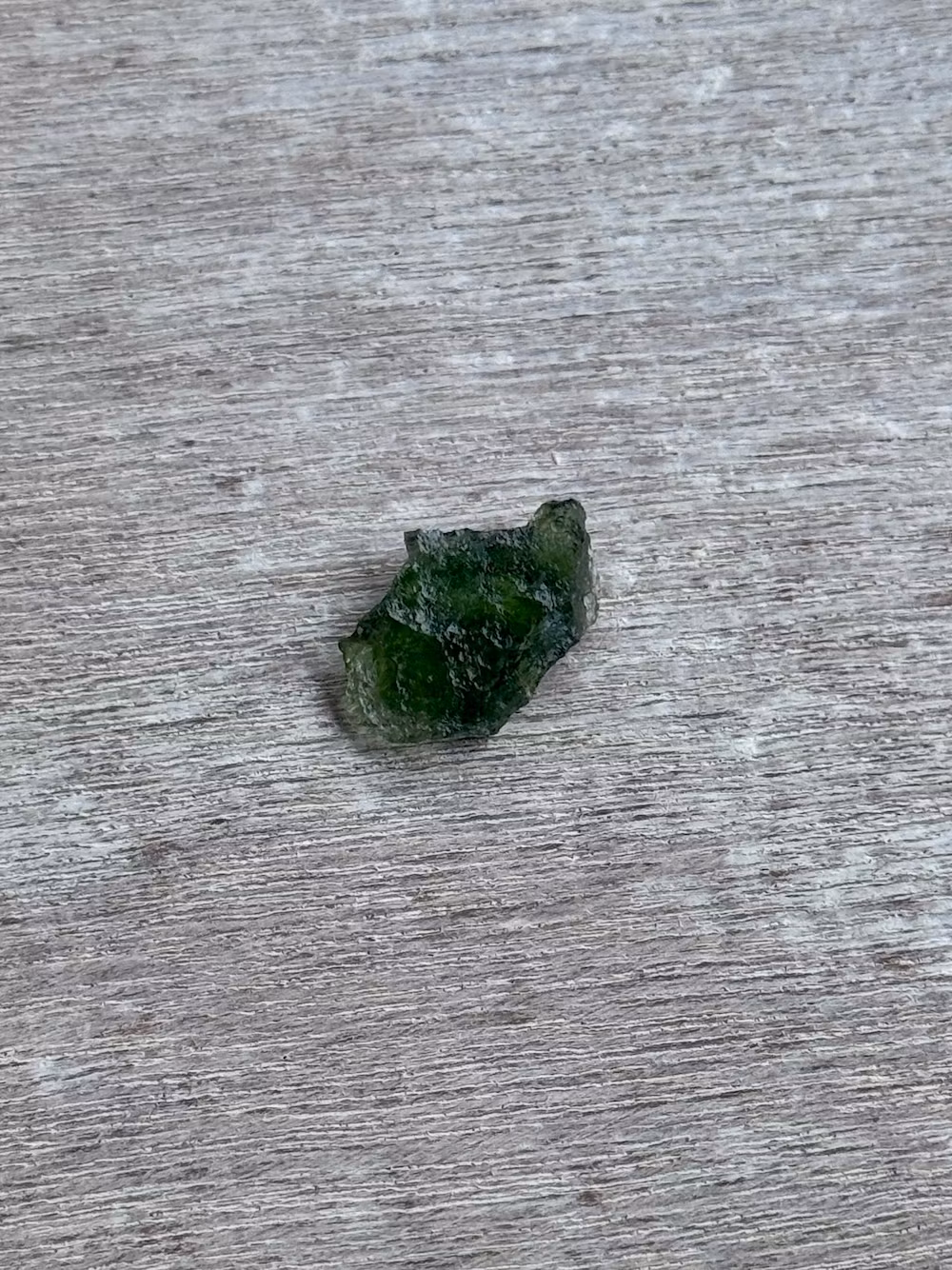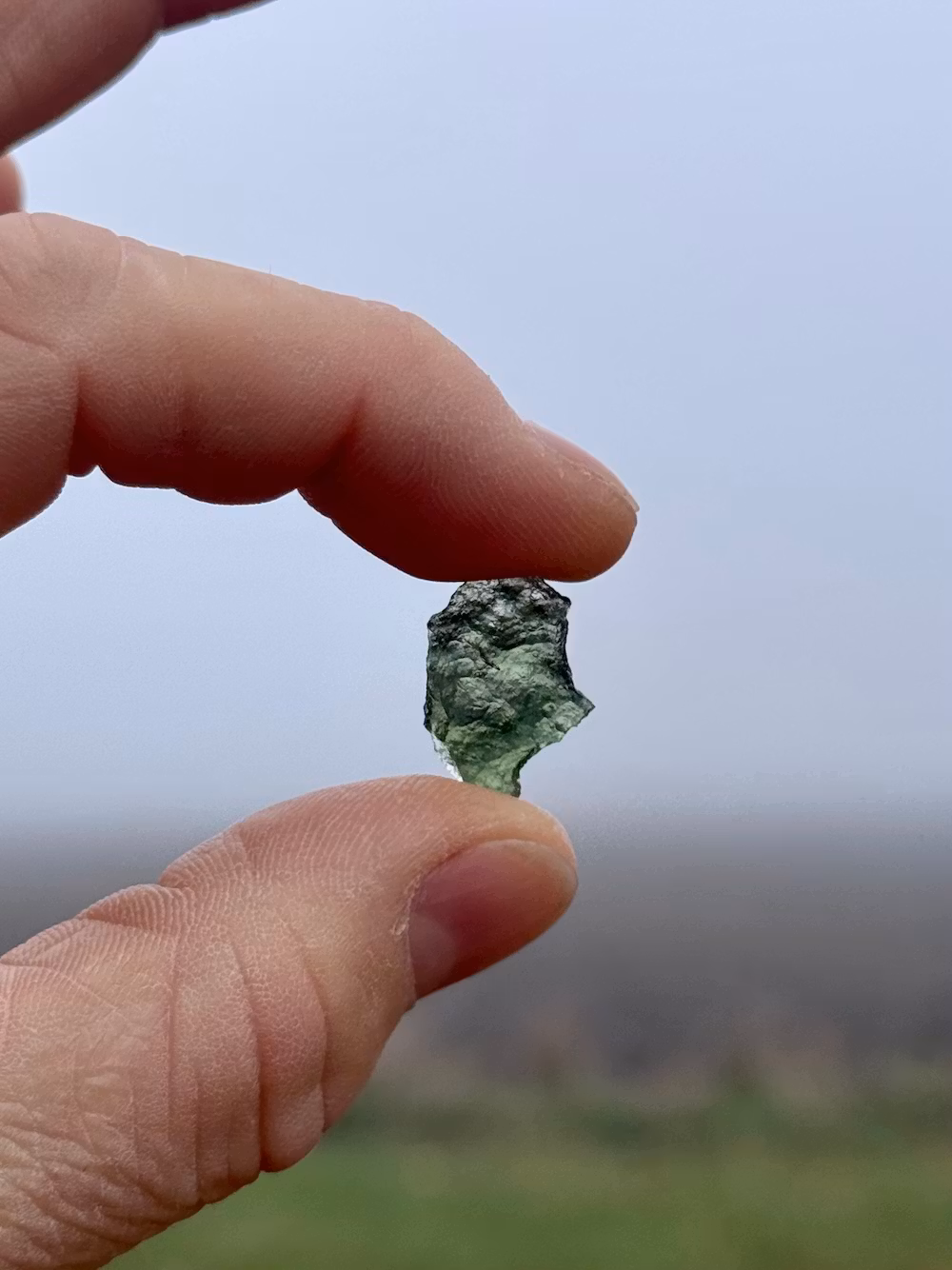 Den otroligt kraftfulla och mycket vackra Moldaviten, här i sin råa form, härstammar från ett meteoritnedslag i nuvarande Tjeckien för ca 15 miljoner år sedan.